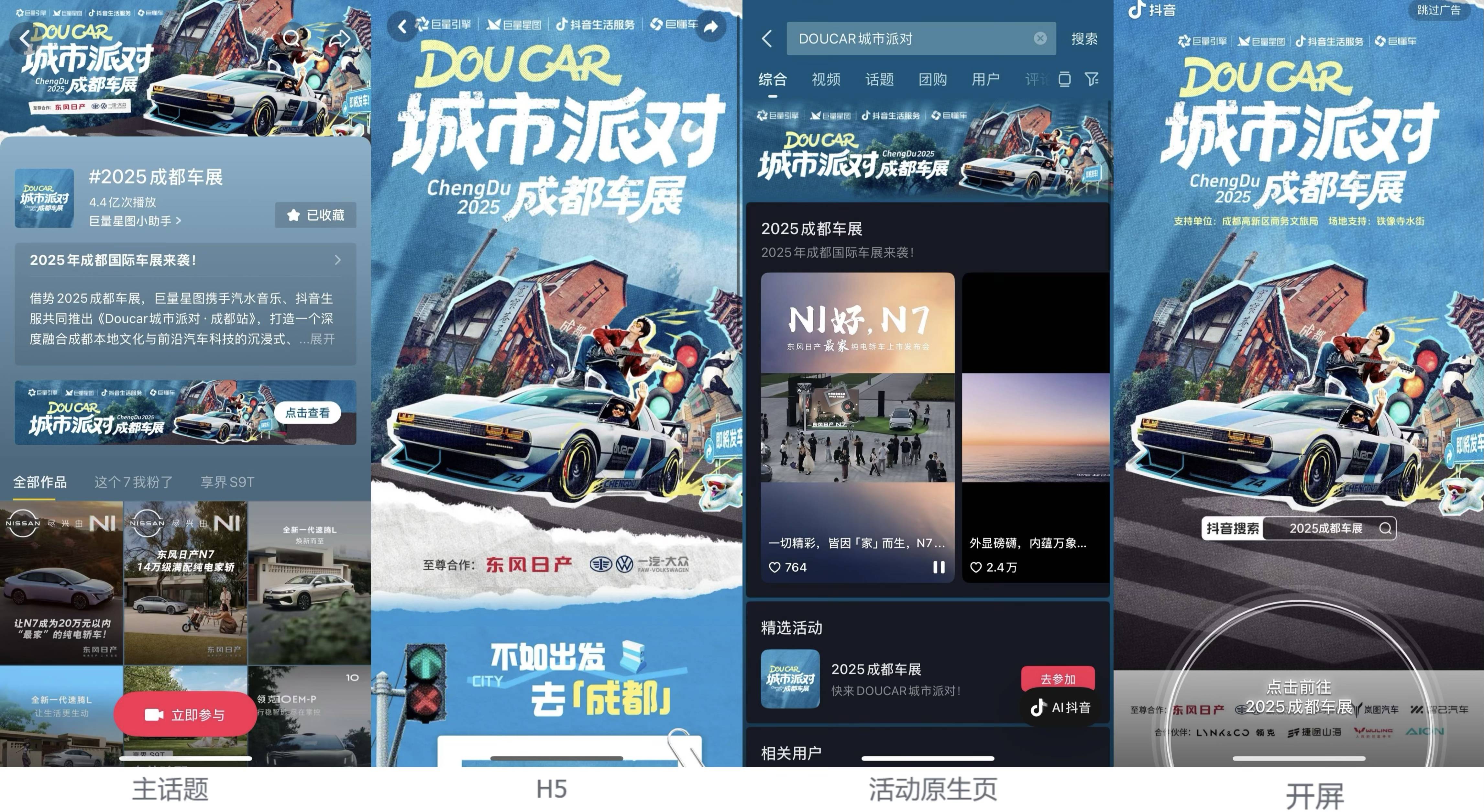 在抖音站内,平台围绕主话题#2025成都车展 和IP构建起多触点强曝光矩阵,上线主话题页、活动H5、活动原生页并投放抖音开屏等广告资源位,高效引流激发创作者投稿热情,也为合作品牌打造线上种草核心阵地。活动期间,整体曝光量超10亿,话题播放量超过5亿,互动量超400万。