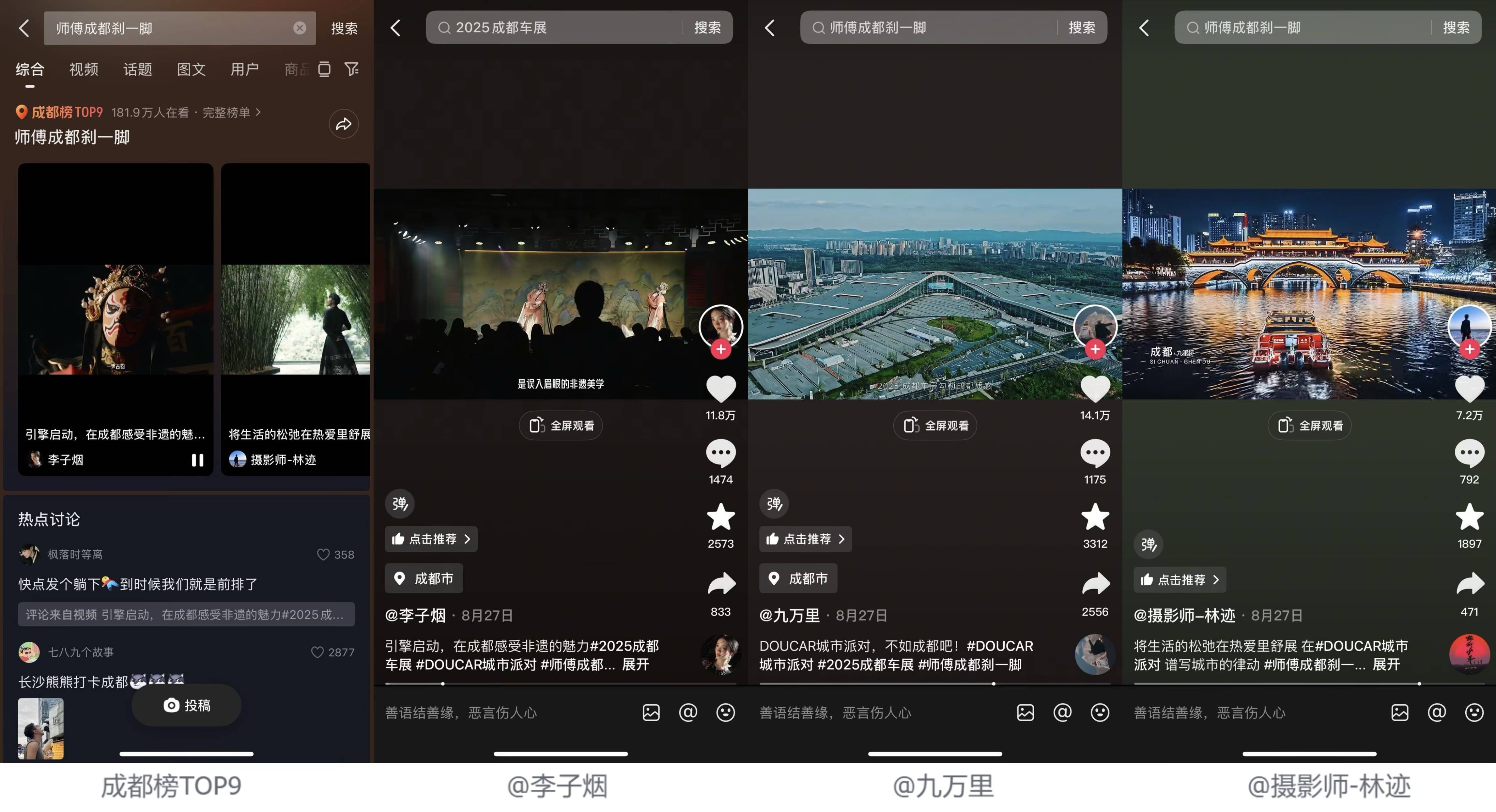 除了车展主话题运营之外,平台联动本地达人人打造趋势内容#师傅成都刹一脚 ,从成都本地文化特色出发为车展造势,聚焦成都非遗文化、先锋生活等不同视角,将汽车与成都巴适生活场景结合进行内容创作,引发本地用户情感共鸣。话题登上成都本地榜TOP9,在榜时长超72小时,累计播放量近千万,不仅成功为车展造势,更让车展与在地文化发生碰撞和共振。